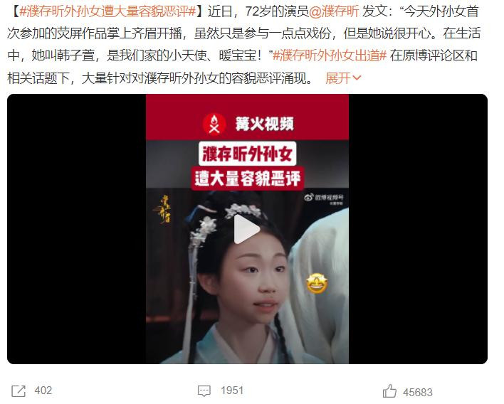 从濮存昕的发文上看,他为我方的外孙女感到高傲,看到这样的情况,许多网友都暗示:韩子萱不成算“星二代”,应该是“星三代”了,最要津的是,大部分网友们并没关联心韩子萱的演技,而是关爱她的长相。