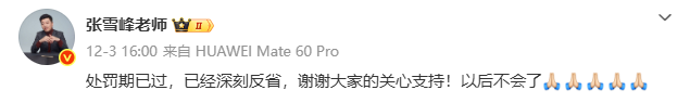 值得注重的是,12月3日,央视新闻报说念,抖音主播“张雪峰”因直播中长工夫使用秽语污言,关联账号限期禁言、停播。随后,张雪峰发文暗意,“照旧深入反省,谢谢大家的护理提拔,以后不会了”。近期,张雪峰复播况且戴上了眼镜,他暗意,“为了跟之前的我方划清畛域,从今天开动直播戴眼镜。以后看到我戴眼镜直播的时候再说脏话,径直给我举报,加倍处罚。”