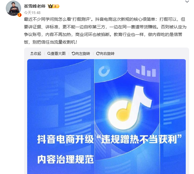 据了解,近日,抖音电商文告升级“违法蹭热不当收货”试验解决标准,张雪峰以为,抖音电商此次新规的中枢很肤浅:打假不错,但要讲凭据、讲标准,更不成一边自称第三方,一边在统一赛说念带货赢利。不然被认定为争议账号,试验不再加热,买卖闭环也被掐断。教师行业也雷同,作念试验吃的是信誉饭,别把信任当流量收割机。
